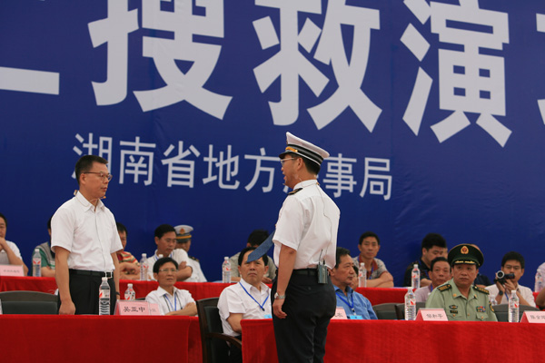 省交通運輸廳廳長吳亞中(圖左)擔(dān)任現(xiàn)場總指揮,省地方海事局局長陳健強(圖右)擔(dān)任現(xiàn)場執(zhí)行總指揮。 此次演習(xí)由湖南省人民政府主辦、湖南省交通運輸廳、湖南省地方海事局承辦,副省長韓永文擔(dān)任演習(xí)總指揮。 演習(xí)于當日上午9時展開。演習(xí)模擬一艘普貨船1號從湘江長沙鑫宇公司碼頭出發(fā)下行,航行至杜甫江閣水域下游花炮平臺正對水域時,與客渡船1號(載客30人、船員2人)發(fā)生碰撞,客渡船1號2名旅客受傷、10名乘客落水,船舶進水失控,面臨沉沒危險。普貨船1號避讓落水人員時又與航經(jīng)此水域的油船1號(裝載柴油500噸)發(fā)生碰撞,致油船1號油艙破損,在自救過程中發(fā)生火災(zāi)、爆炸,并發(fā)生柴油泄漏。 經(jīng)湖南省水上搜救中心組織、指揮、協(xié)調(diào)專業(yè)和社會力量全力救助,落水人員全部獲救,受傷人員緊急轉(zhuǎn)送到市區(qū)醫(yī)院,遇險乘客安全轉(zhuǎn)移;遇險船舶拖至安全水域靠泊。油船大火被撲滅,溢油得到控制,油污得到有效清除。演習(xí)歷時90分鐘,取得圓滿成功。 據(jù)悉,我省共有航道里程11968公里,居全國第三;渡口6074座,渡船4203艘,有船水庫145座、2700平方公里,均居全國第一。2009年全省完成水路貨運量1.18億噸、貨物周轉(zhuǎn)量255億噸公里,與“十五”末的2005年相比,分別增長156%、34%,我省水路貨運量約占全省社會運輸總量的10%,水路貨物周轉(zhuǎn)量占全社會總量的13%。水路運輸快速增長,確保水運安全,提高全省水上應(yīng)急搜救能力日益重要。此次演習(xí)不僅檢驗了《湖南省水上搜救應(yīng)急預(yù)案》的實用性和可操作性,以及多部門聯(lián)合應(yīng)急救援機制,而且積累了水上人命救助、船舶消防、水域防污染等方面的實戰(zhàn)經(jīng)驗,提高了我省水上應(yīng)急搜救的組織、協(xié)調(diào)和指揮能力。 韓永文在演習(xí)順利結(jié)束后指出,在水運經(jīng)濟快速發(fā)展的今天,我們必須高度重視水上交通安全和水運環(huán)境保護工作,要時刻警醒、時刻準備,要全面提高監(jiān)管救助和應(yīng)急水平,及時有效地應(yīng)對水上突發(fā)應(yīng)急事件,切實保障人民生命財產(chǎn)安全。全省各地各有關(guān)部門、單位要以此次演習(xí)為契機,認真總結(jié)經(jīng)驗,從“保障人民生命財產(chǎn)安全”的高度,把水上應(yīng)急管理工作擺到更加突出的位置,用更多的精力,采取更強的措施,切實做好應(yīng)對水上突發(fā)事件工作,為維護公共安全、構(gòu)建和諧社會提供有力保障。