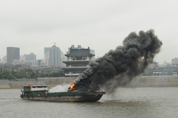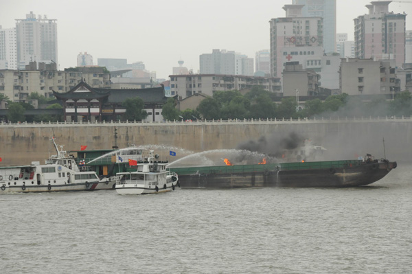 圖四 圖片說明 一、上午9時,一艘300噸的普通貨船從長沙鑫宇公司碼頭出發(fā)下行航行至湘江杜甫江閣下游花炮平臺水域時候,與一搜客渡船發(fā)生碰撞,客渡船2名乘客受傷,10人落水,船體進水失控,面臨沉沒危險。 二、這搜普通貨船在避讓落水人員時,又與經(jīng)過的另外一艘油船發(fā)生碰撞,致該船油艙破損,油船在自救過程中發(fā)生火災(zāi)、爆炸,并出現(xiàn)柴油泄漏。 三、湖南省水上搜救中心接到報警后,組織水上搜救隊緊急行動,各部門全力配合。落水乘客最先全部獲救,傷者也被送往醫(yī)院。之后遇險船舶被拖往安全水域。 四、大約50分鐘后,油船大火被撲滅,溢油得到控制,油污被有效清除。 |