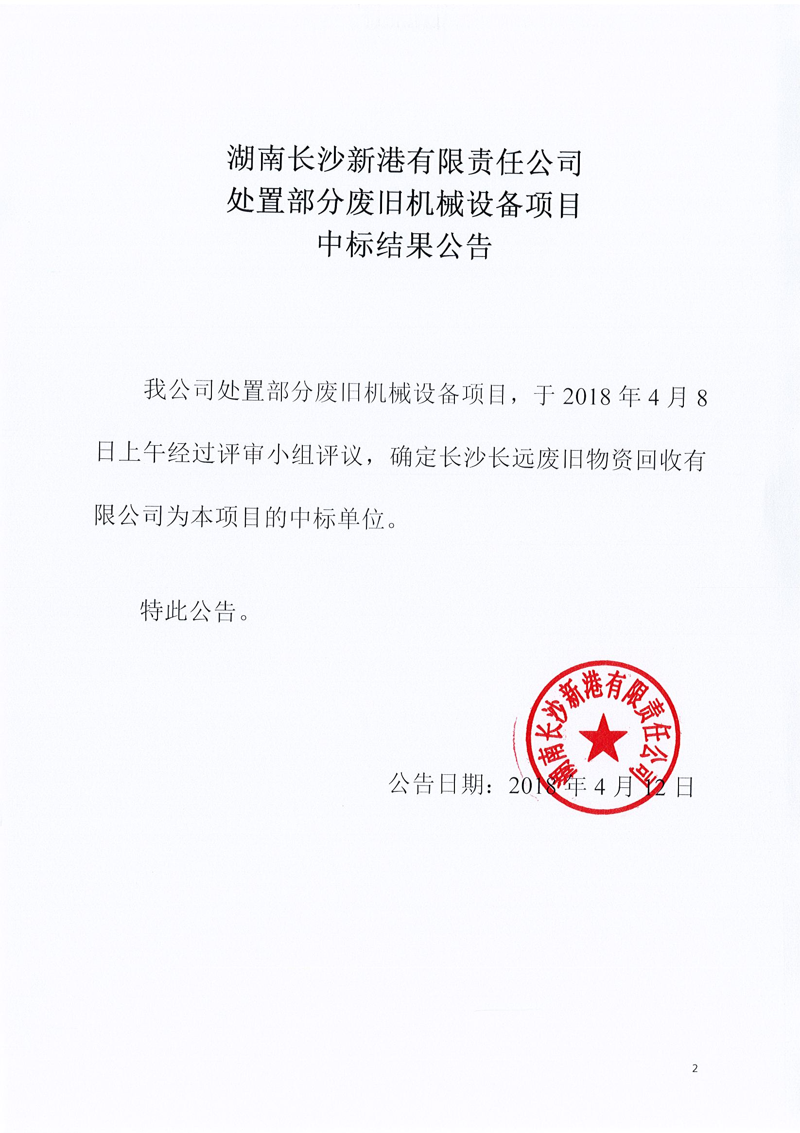 湖南長沙新港有限責任公司 處置部分廢舊機械設備項目中標結(jié)果公告