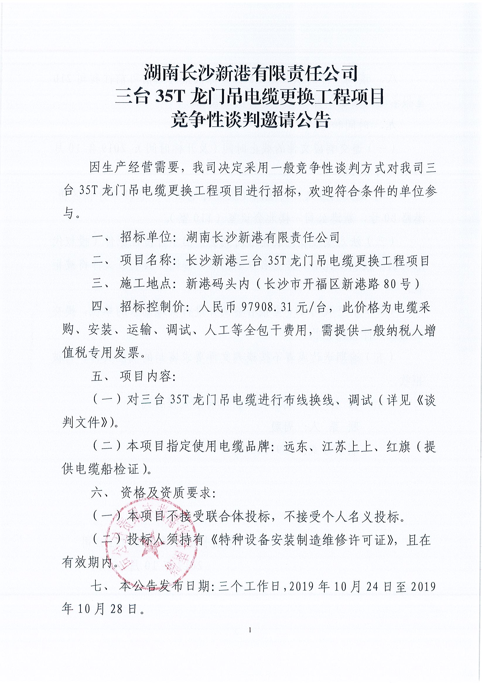 湖南長沙新港有限責(zé)任公司三臺(tái)35T龍門吊電纜更換工程項(xiàng)目競爭性談判邀請公告